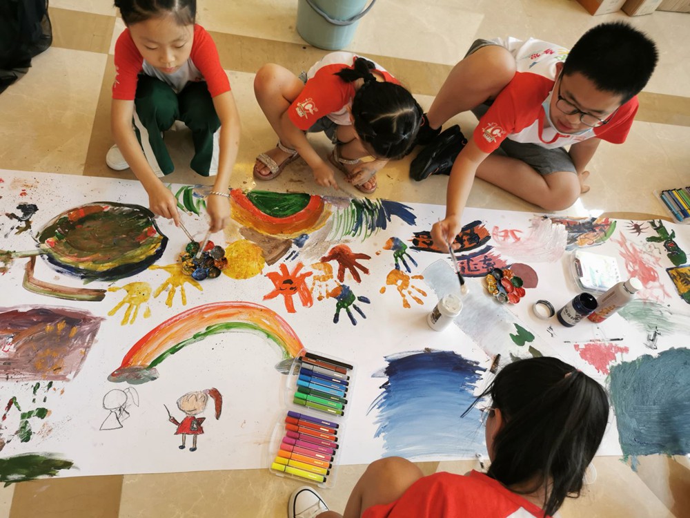 只见他们有的充分发挥着自己的创造力,,,化身“小毕加索”,,,在画布上无拘无束地释放自己的艺术灵感;有的仔细观察窗外的晴空和艳阳,,一笔一画细心创作;过程中,孩子们互帮互助,,,,帮着调颜料、、、、涂色彩,,合力完成这“梦的长卷”。。。
