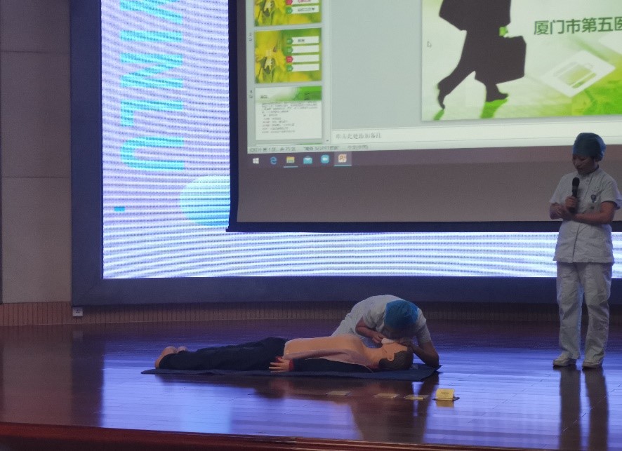 讲座现场,, 张护士长及其团队的优秀护士们携带了人体模型,,,认真演示了人工呼吸、、、、心肺复苏急救法的动作规范,,通过情景互动方式,,,,让员工了解如何判断现场环境是否安全,,,通过角色扮演加强印象,,,,让每个人有练习的机会。。。。
