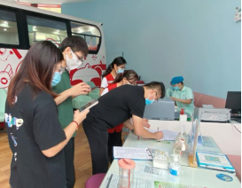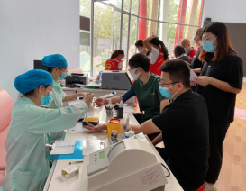 在献血屋内,,,,参加献血的尊龙时凯伙伴们在医务人员和机关志愿者的引导下,,有序完成扫码测温、、、、预约登记和体检采血。。。