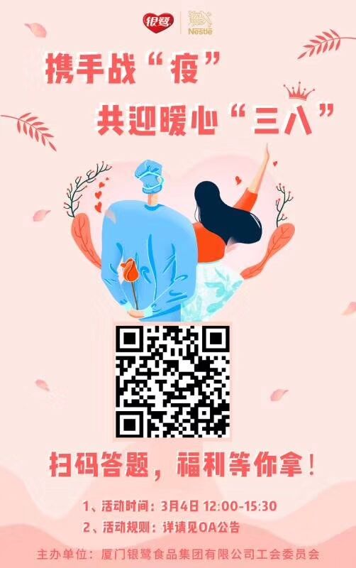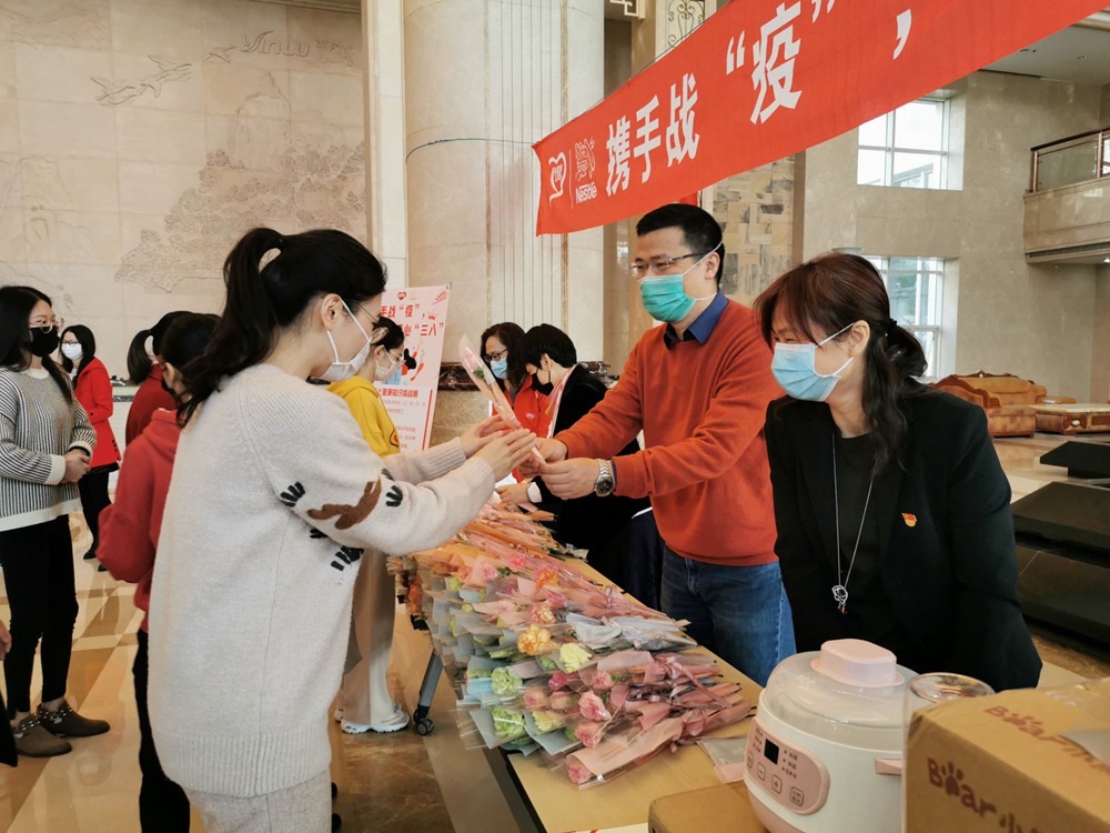 为庆祝节日的到来,,尊龙时凯食品集团工会委员会,,人力资源中心围绕“携手战“疫” 共迎暖心三八“这一主题,,,开展系列活动,,,活动由厦门尊龙时凯与雀巢大中华区活动有机结合,,,,为女性员工们送上特别的祝福与问候。。