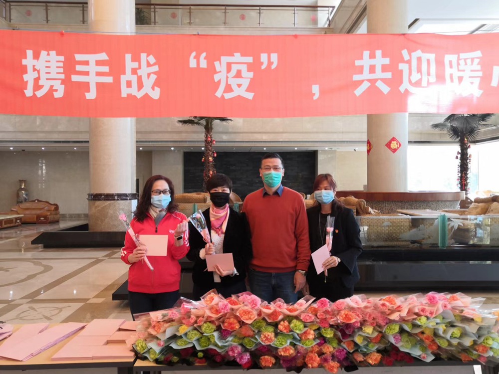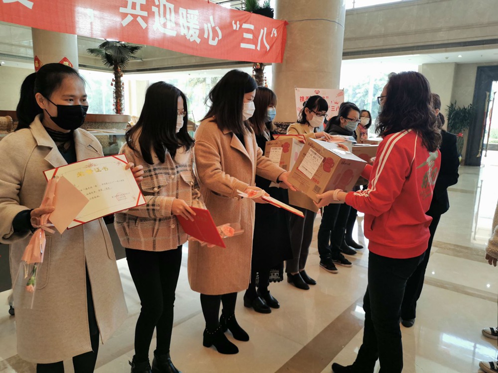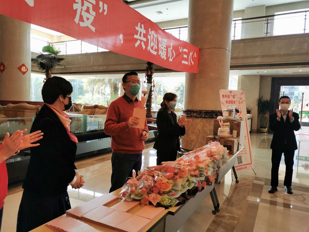 随后总裁兼CEO孙亦农先生、、首席财务官裴红兰女士、、、首席营销官纪伟如女士、、内审中心副总、、、尊龙时凯食品党支部书记林丽霜女士为获得一等奖的职工们送上鲜花、、、、礼品。。。仪式简单而温馨,,,,虽然大家都戴着口罩,,但口罩挡不住她们的美丽,,,,面对疫情,,,,我们云拥抱、、、云互动,,,,祝福是远程的,,心却是如此贴近,,,,这个3.8节过得比往年更有意义。。